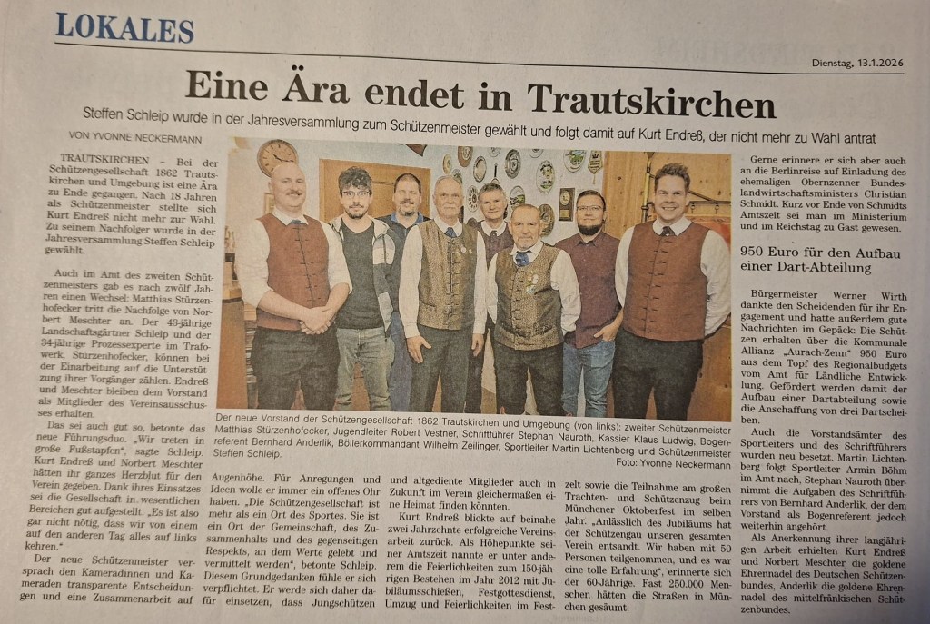 Am 9. Januar 2026 fand unsere Jahreshauptversammlung für das Jahr 2025 statt. Als Nachfolger für die langjährigen Schützenmeister Kurt Endreß und Norbert Meschter wurden Steffen Schleip und Matthias Stürzenhofecker gewählt.