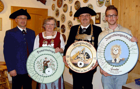 Schützenmeister Kurt Endreß durfte die Königskette dem neuen Schützenkönig Hans Stürzenhofecker ebenso umhängen wie Damenkönigin Elisabeth Hecht und Jugendkönig Andreas Lorenz. Begleitet wird der Schützenkönig von den Rittern Gerhard Hecht und Andreas Eder, die Damenkönigin von 1. Ritter Christa Mauser und 2. Ritter Lisa Böhm und der Jugendkönig von 1. Ritter Leonie Endreß und 2. Ritter Manuel Rückert. Bei den Herren siegte Gerhard Hecht auf der Glücksscheibe vor Norbert Lang und Werner Ströbel, bei den Damen wurde Renate Knapp Erste vor Elisabeth Hecht und Monika Ströbel und bei der Jugend-Glückscheibe sicherte sich Robert Vestner den 1. Platz vor Andreas Lorenz und Veronika Anderlik.Nach der Proklamation lud der neue Schützenkönig die Anwesenden zum Büffet mit vielen Leckereien und Getränken ein.