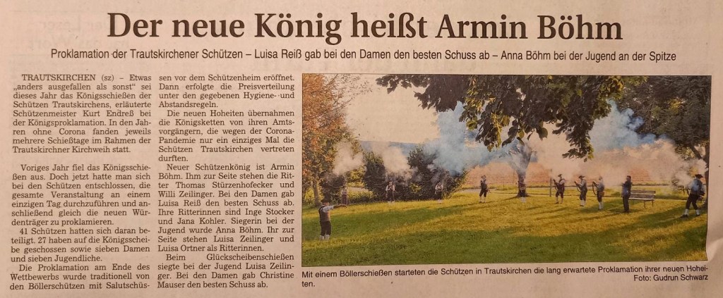 Am 30. April wurden Jochen Slotta, Lisa Böhm und Luisa Ortner als neue Könige proklamiert. Stellvertretend für die verhinderte Luisa Ortner nahm Anna Böhm als 1. Ritter die Jugendkönigscheibe entgegen.