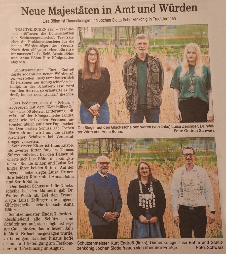 Die Schützengesellschaft Trautskirchen proklamierte ihre neuen Schützenkönige, die im Jubiläumsjahr den Verein bei allen Veranstaltungen begleiten werden. Insgesamt beteiligten sich 34 Herren, 11 Damen und sieben Jugendliche am Wettbewerb. Der Proklamationsabend wurde von den Schützen der Böllerabteilung eröffnet. Anschließend wurden die neuen Majestäten in ihr Amt eingeführt.