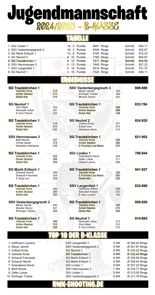 Die Jugendmannschaft steht aktuell nach 4 gewonnenen Wettkämpfen und 8:12 Punkten auf Platz 5 in der B-Klasse.